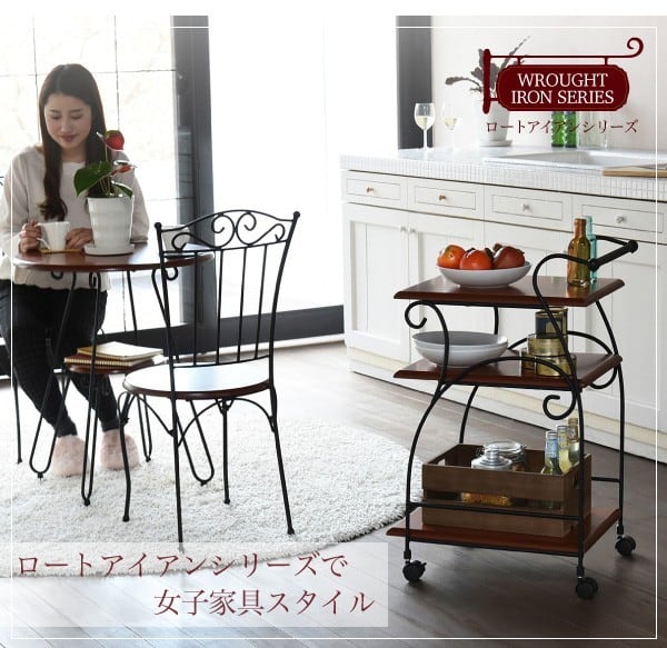 ダイニングテーブルと揃えてヨーロピアンなお部屋を作る女性らしいアイテム。キャスターにはロックが付いているので、お料理を運ぶとき以外でもキッチンラックとしてご使用いただけます。