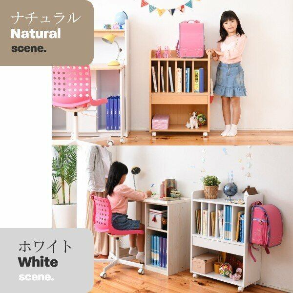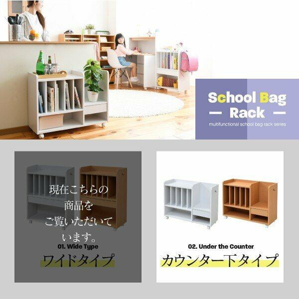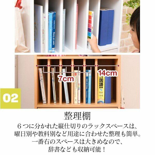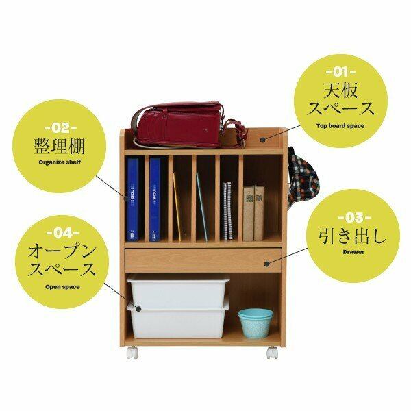 「リビング学習」にぴったりなキャスター付きのランドセルラック。真ん中の仕切り棚は6つに仕切られているので曜日や科目に合わせて収納できます。幅の広い右側は辞書などの収納に。真ん中の引出しはペンケース等や、学校から配られるプリント類に便利です。本体横は左右どちらかにフックの取り付けが可能です。